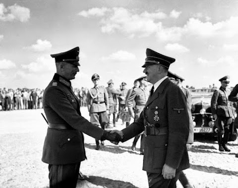 01.06.1940, Bruselas. Hitler saluda al General der Artillerie Georg von Küchler (comandante del 18º Ejército) con von Bock en el Centro. En segundo término Walhter von Brauchitsch mirando hacia abajo
